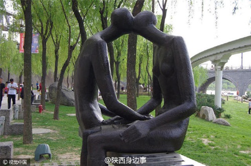 西安曲江寒窯公園門口驚現(xiàn)裸體雕塑,一尊尊看起來(lái)構(gòu)想大膽、形象生動(dòng)的愛(ài)情主題雕塑,也迅速在網(wǎng)上火爆瘋傳,奔放、性感、害羞……網(wǎng)友的各種評(píng)價(jià)聲音中,有不少人直呼尺度過(guò)大,甚至多數(shù)人認(rèn)為這樣大尺度雕塑現(xiàn)身相對(duì)開放的公園里,有點(diǎn)不太合適。西安寒窯遺址公園門前,雕塑呈點(diǎn)綴分布趨勢(shì),包括網(wǎng)上熱議的雕塑《依戀》《重返伊甸園》《上帝之吻》《融》等雕塑都分布在此區(qū)域。